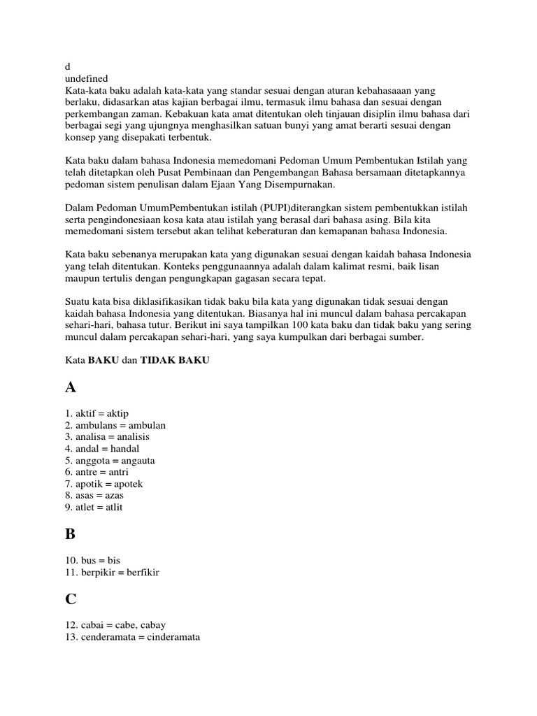 3.bahasa melayu tidak mengenal kelas atau strata sosial bahasa seperti bahasa daerah lain, misalnya bahasa jawa dan sunda.dipilihnya bahasa melayu sebagai dasar bahasa indonesia. Sedangkan suatu kata dianggap tidak baku apabila kata yang digunakan tidak sesuai dengan kaidah bahasa indonesia. Pada umumnya bahasa baku digunakan dalam. (2) kebiasaan makan makanan yang salah dapat disebut sebagai contoh. Gunakan yang akan sesuai dengan konteks kalimat.